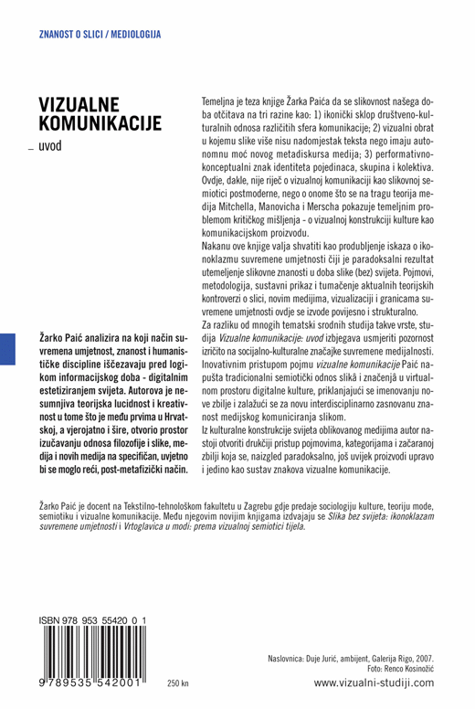Knjiga dr. sc. Žarka Paića, docenta na Studiju modnog dizajna Tekstilno-tehnološkog fakulteta i gosta predavača na Akademiji likovnih umjetnosti Sveučilišta u Zagrebu, Vizualne komunikacije – uvod teorijska je studija o novom interdisciplinarnom predmetu na granici društvenih, humanističkih i kulturalnih znanosti. Analiza vizualnih komunikacija istodobno je metodološki i epistemološki usmjerena spram semiotike vizualne kulture kao komunikacijskog sustava. Unutar njega se raščlanjuju: