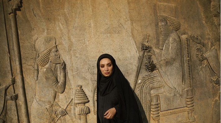 Fiugre 3: On location at Persepolis, an actress in Islamic dress passes before 2,500-year-old carvings proclaiming the might of a Persian king.