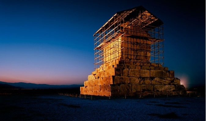 Figure 4: Pasargadae: Scaffolding surrounds the tomb of Cyrus the Great (ca 559 to 530 B.C.), the first Persian emperor, while archaeologists strive to restore its roof. Admired as an early champion of human rights, Cyrus allowed religious diversity and respected the local customs of those he conquered.