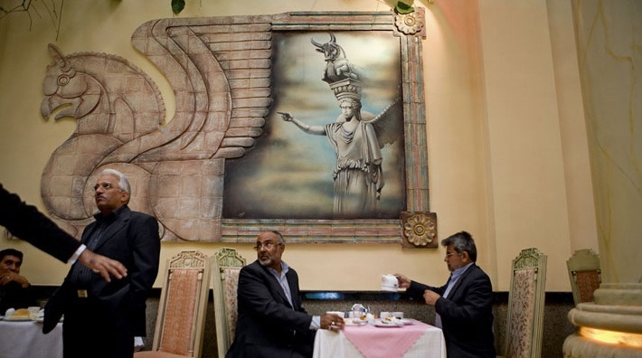 In this picture we see upscale Iranian men having breakfast at the “opulent Dariush Grand Hotel on the island of Kish”. The piece of art hanging on the wall portrays the griffin, a legendary creature with the body of a lion and the head and wings of an eagle. The griffin was supposed to be a very powerful creature because it mixed the lion, the king of the beasts and the eagle, the king of the birds. In ancient times, the griffin was a symbol of divine power but in the Achaemenid Persian Empire the griffin was considered a protector from evil, witchcraft and secret slander. The griffin is supposed to have originated in Greece but it also appears in such sites as Persepolis. The winged goddess must be Nike, the Greek goddess of victory. She is represented pointing to a certain direction. The bull at the top of the pillar probably symbolizes power. Symbolically this piece of art talks about the Iranians’ ambition for power.